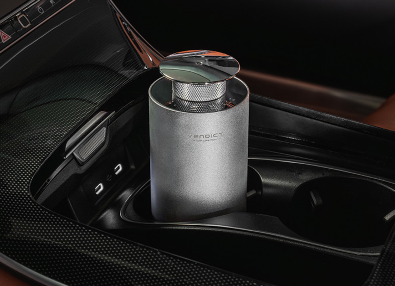 애트모어는 무광 메탈 바디와 크롬 탑 커버로 구성되어, 차량 인테리어와 완벽하게 어우러집니다. 컵홀더에 딱 맞는 슬림한 디자인은 공간 활용도를 높여주며, 상단의 다이얼 방식은 고급 오디오의 볼륨 조절을 연상시켜 조작의 즐거움을 더해줍니다.