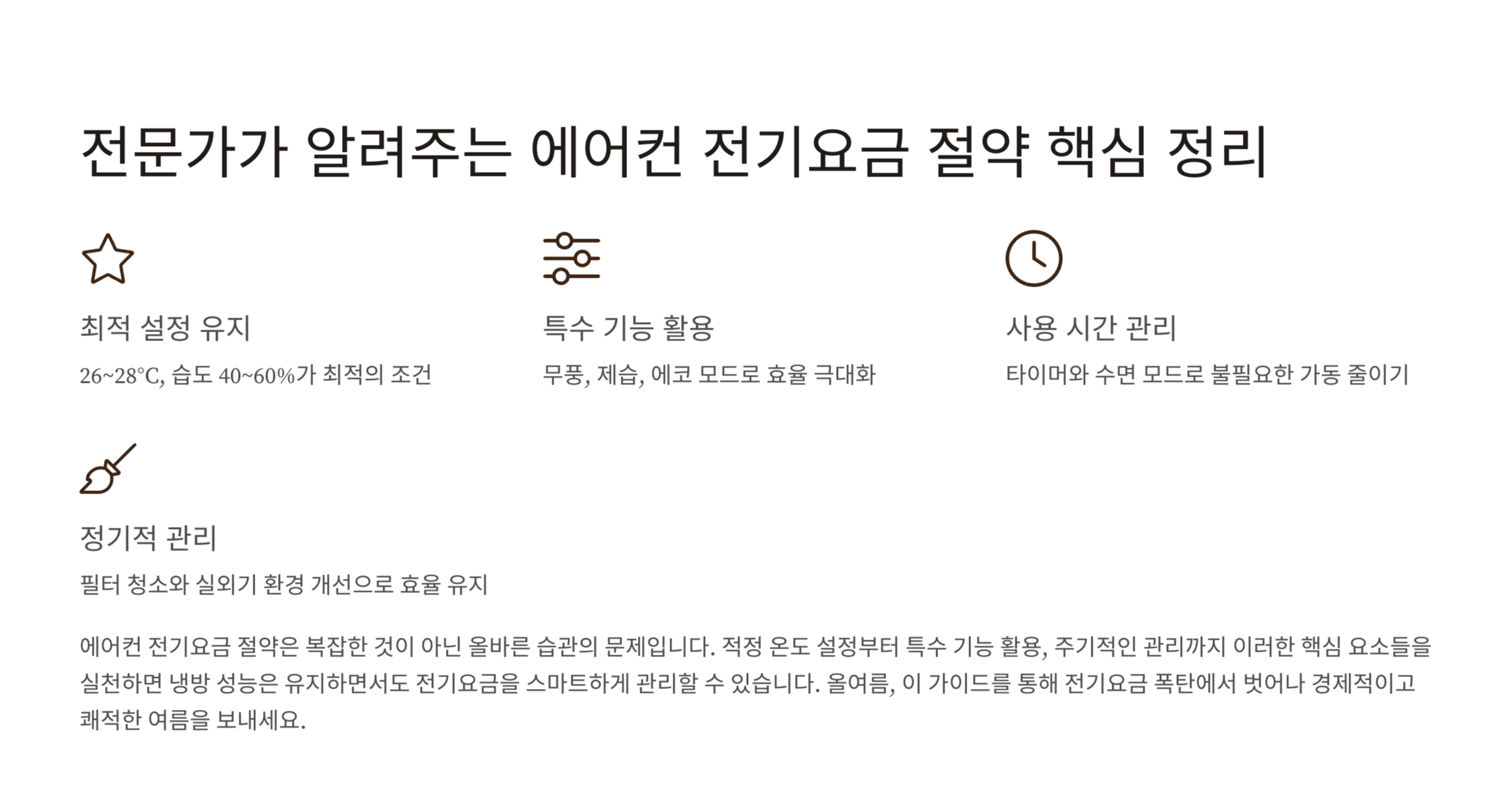 작은 생활 습관의 변화만으로도 냉방 효율을 크게 높이고 전기요금을 줄일 수 있습니다. 쾌적함은 유지하면서도 효율적인 소비를 실천해보세요. 여름철 에어컨 사용은 습관이 성패를 좌우합니다. 올바른 사용법으로 전기요금을 스마트하게 관리해보세요!