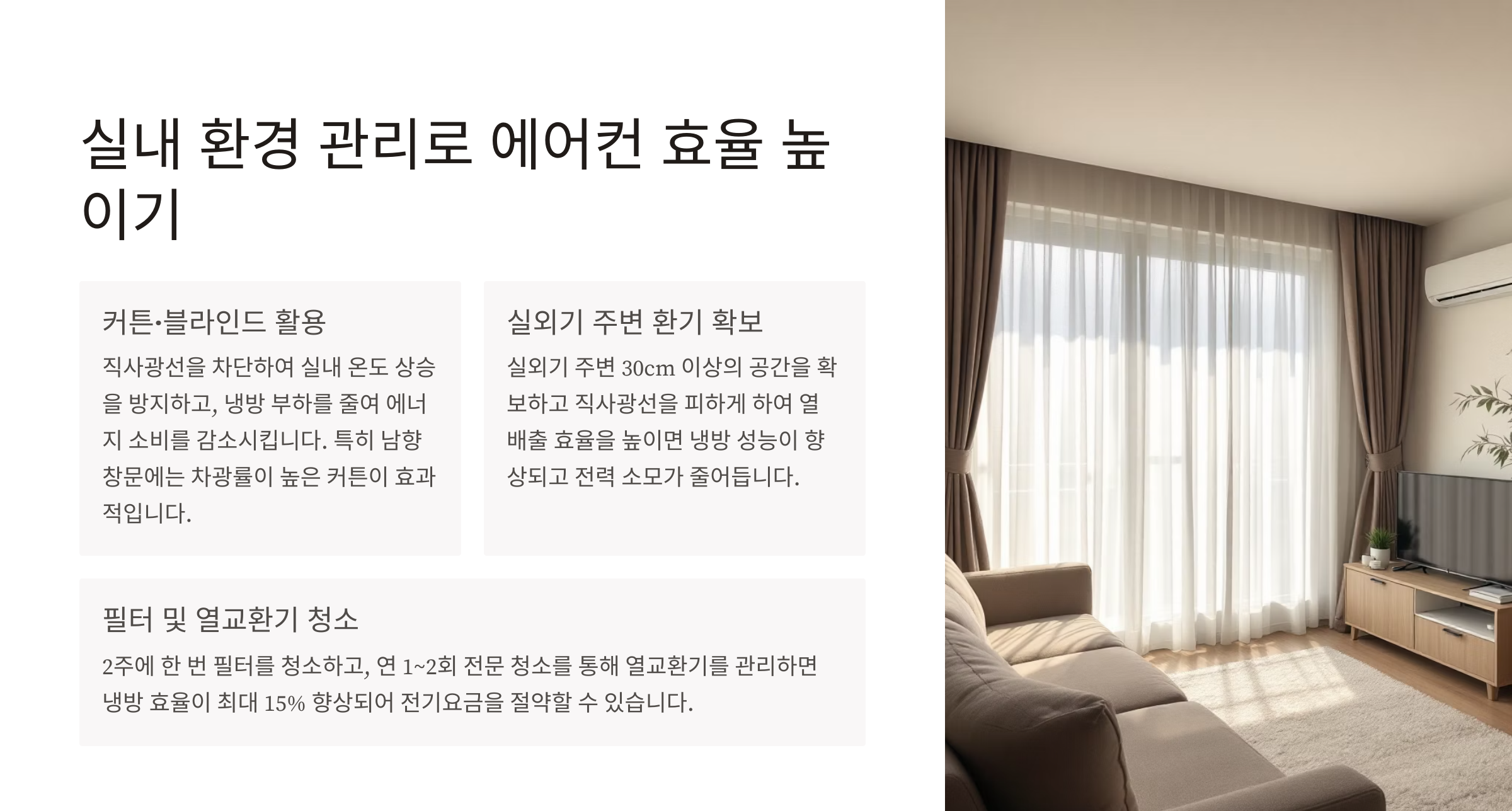 - 커튼·블라인드 활용: 직사광선을 차단해 실내 온도 상승 방지