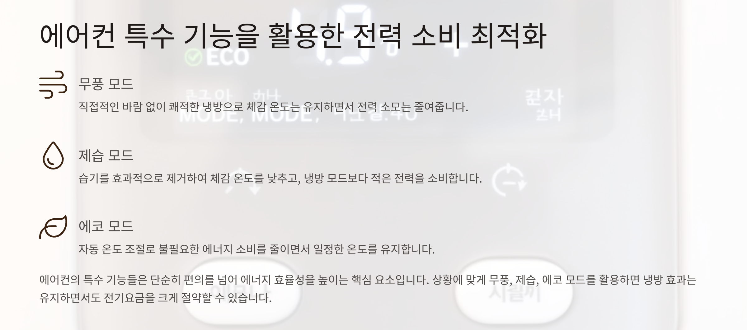 - 제습 모드: 습기를 잡아 체감 온도를 낮춰주며, 전력 소모가 낮음