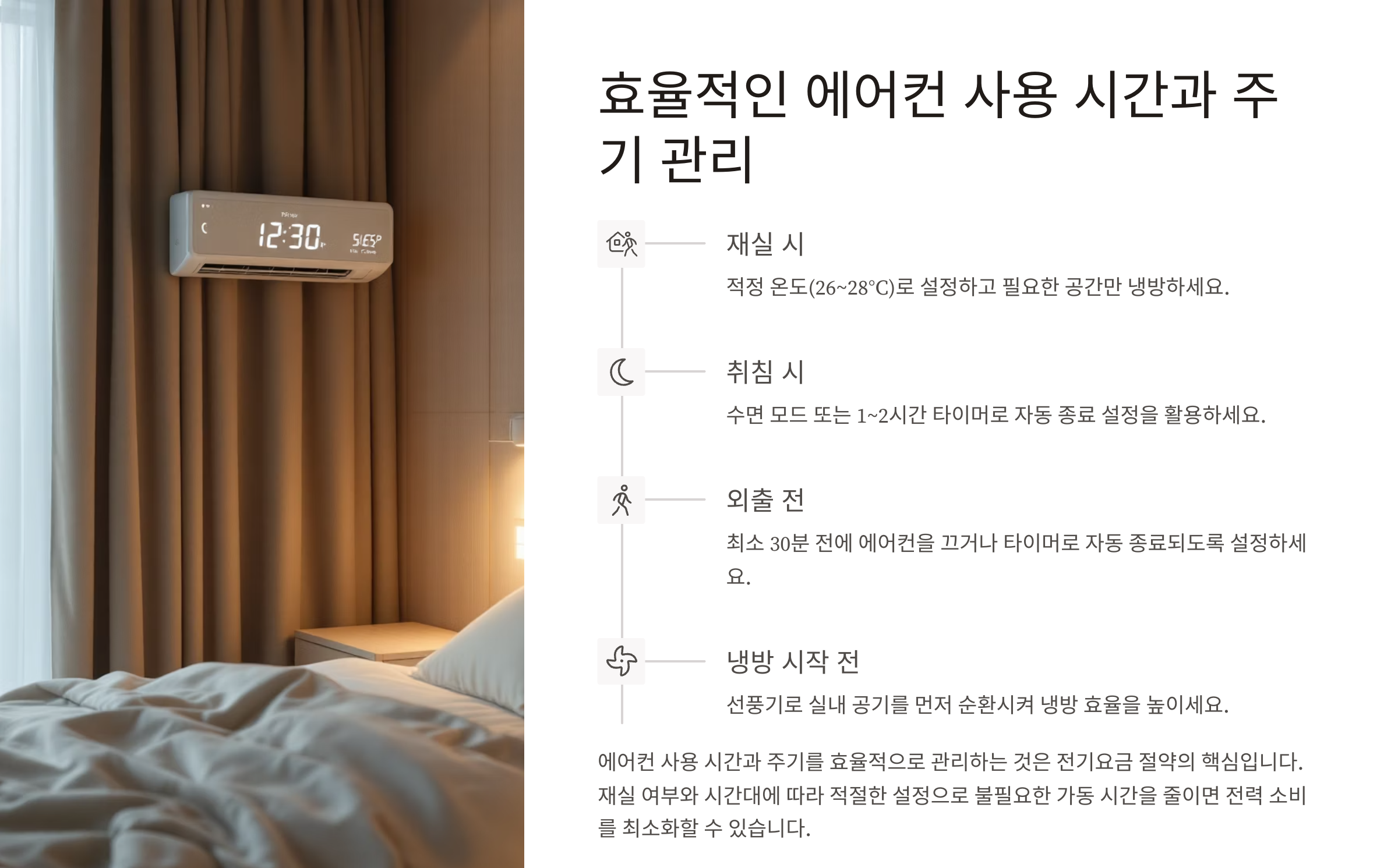 - 환기 시간 관리: 외부 온도가 낮은 이른 아침이나 저녁에 환기하고, 냉방 중에는 창문과 출입문 개폐를 최소화하세요.