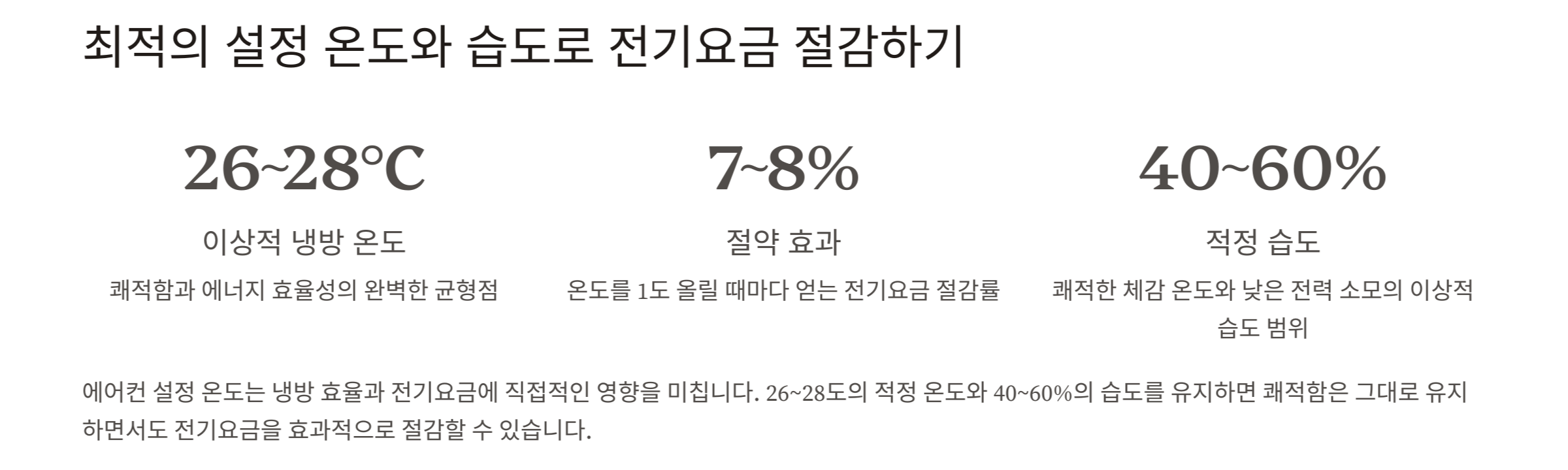 - 실내 습도는 40~60% 유지가 쾌적하고 전력 소모도 낮습니다.