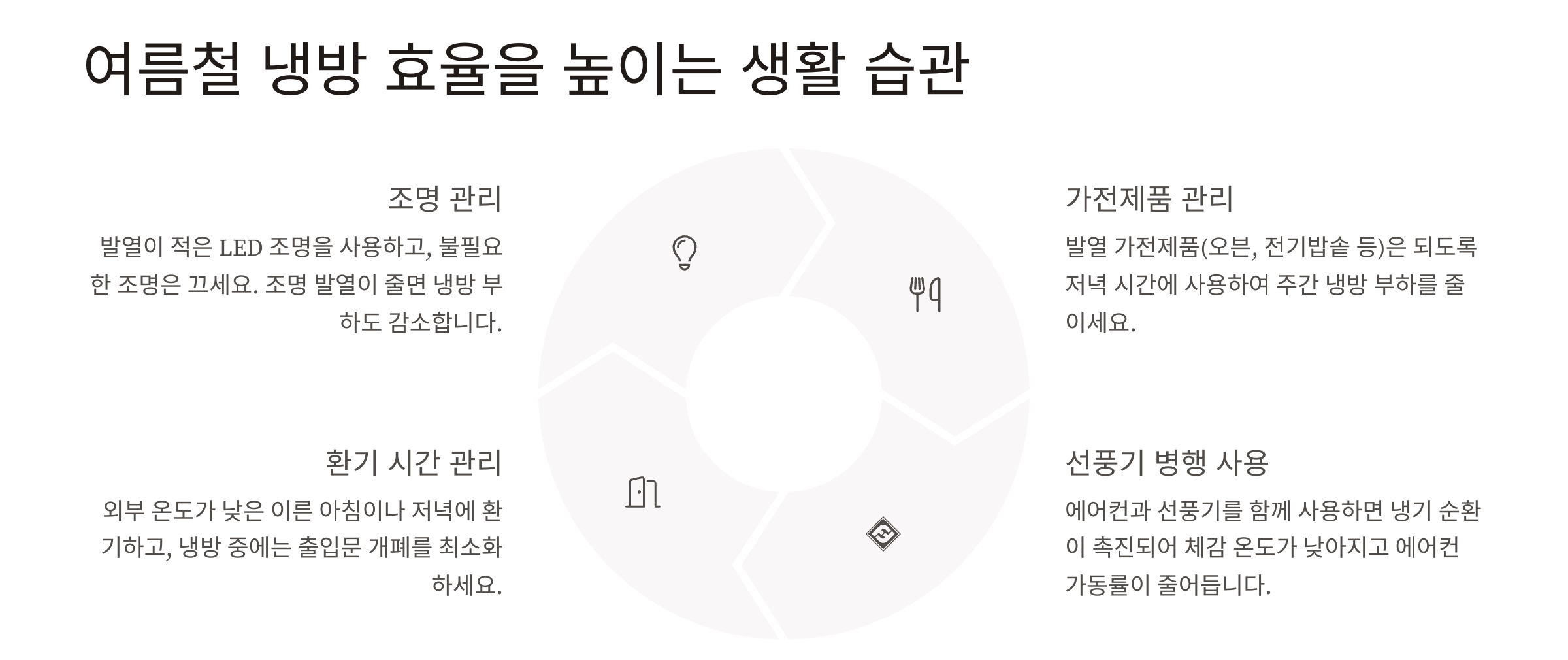 - 냉방 시작 전 선풍기로 실내 공기 순환을 먼저 시도하면 냉방 효율 증가