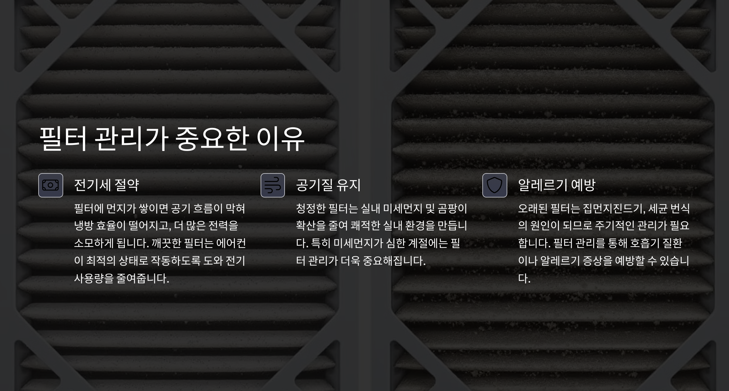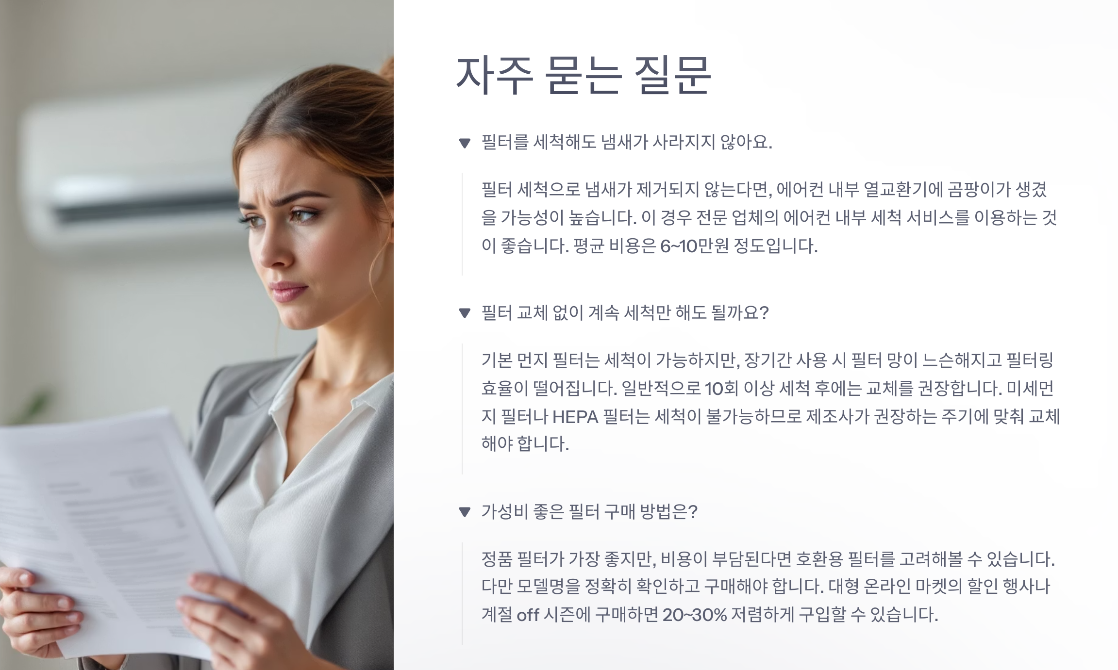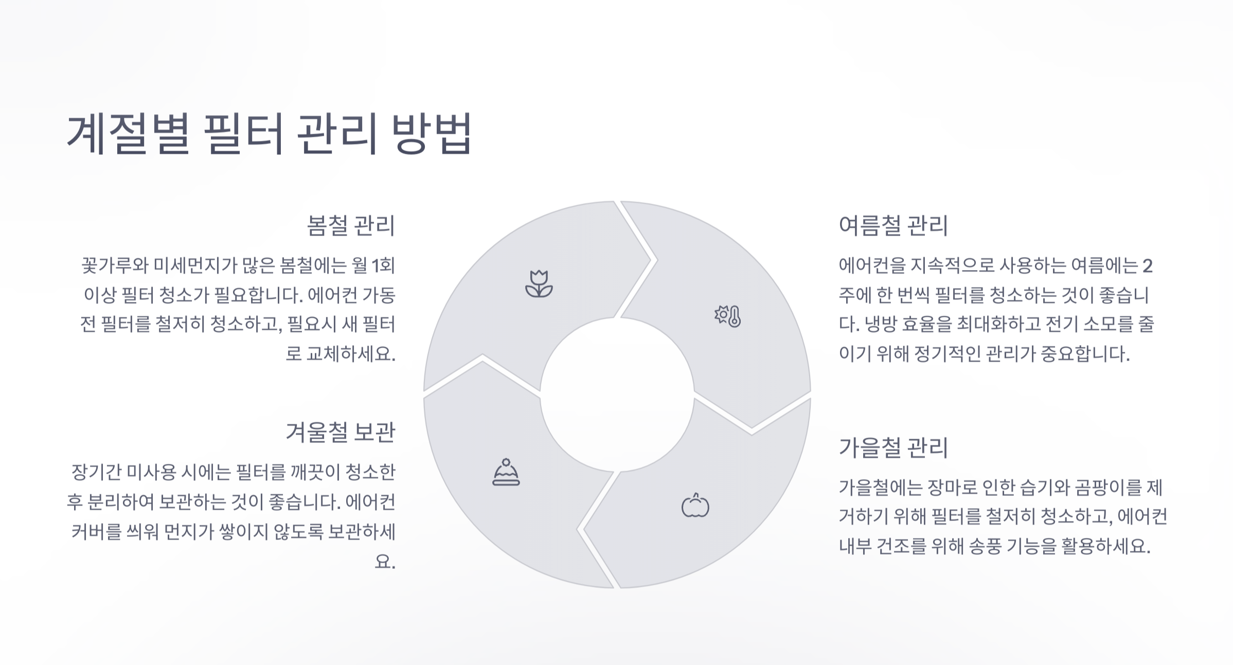 - 알레르기 예방: 정기적인 필터 관리는 에어컨 수명을 최대 30%까지 늘릴 수 있습니다. 고가의 제품일수록 교체 주기 관리가 경제적인 투자입니다.