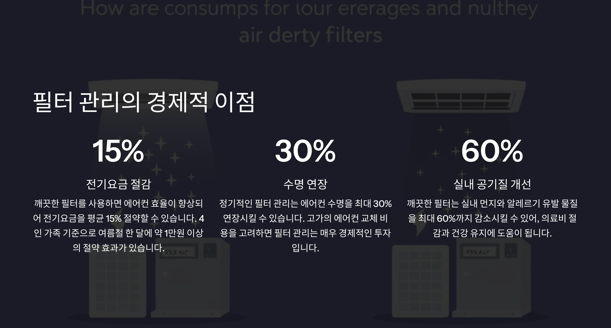 - 전기세 절약: 필터에 먼지가 쌓이면 공기 흐름이 막혀 냉방 효율이 떨어지고, 더 많은 전력을 소모하게 됩니다. 깨끗한 필터는 에어컨 효율을 향상시켜 전기요금을 평균 15%까지 절약할 수 있습니다. 4인 가족 기준, 여름철 한 달에 약 1만 원 이상의 절약 효과가 있습니다.