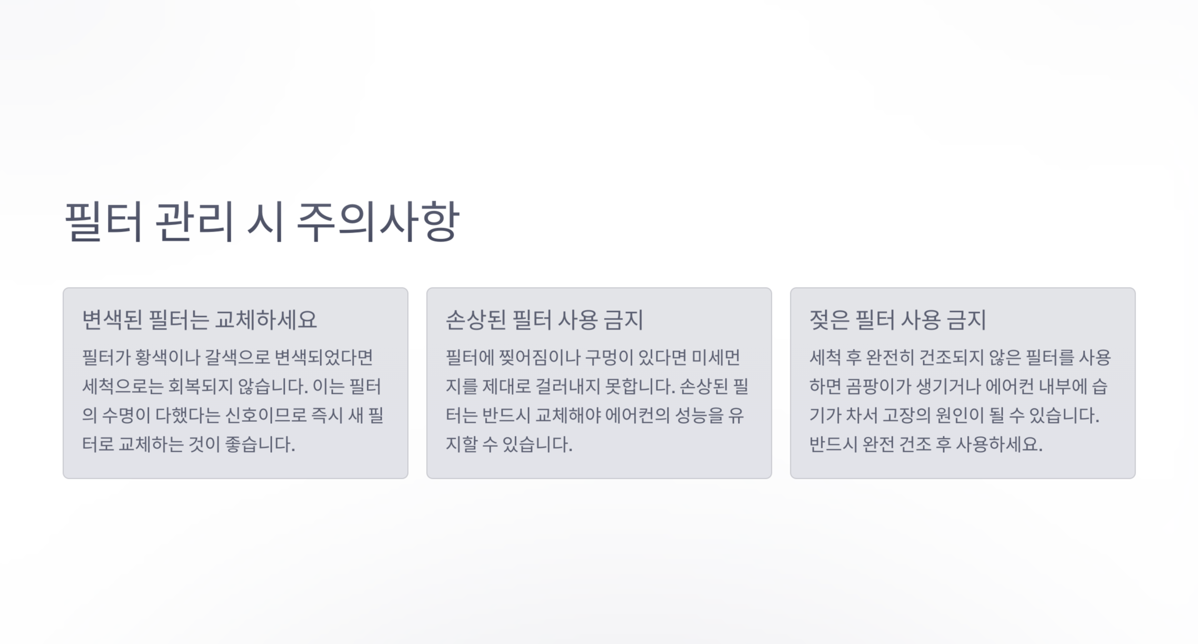 ※ 사용 환경에 따라 교체 시기는 달라질 수 있으며, 반려동물 또는 도로 인접 가구는 더 자주 교체 권장 드립니다. 필터의 색이 변하거나 먼지가 눈에 뛰게 쌓인 경우 즉시 교체하세요
