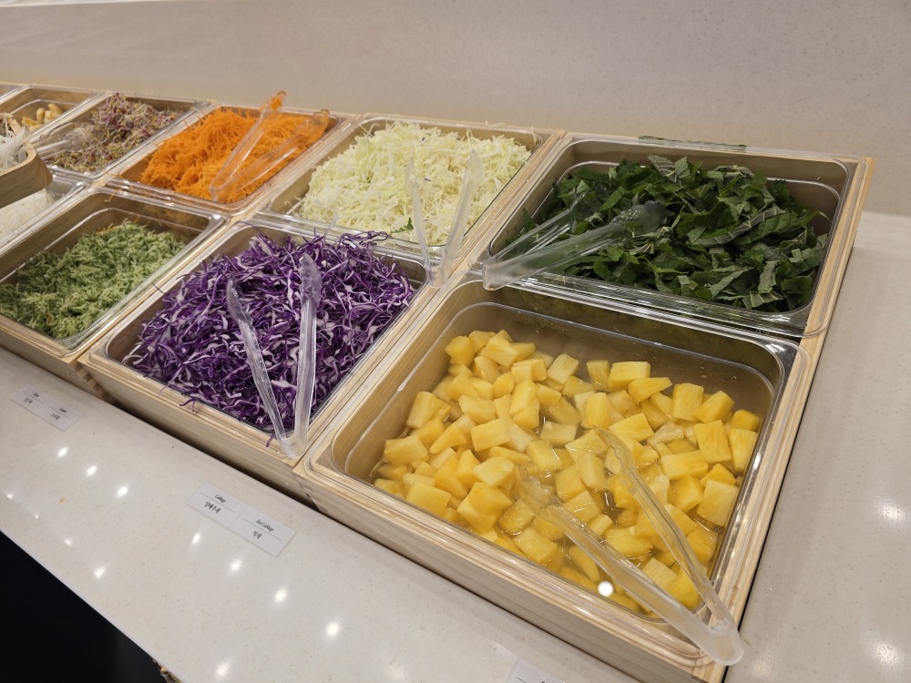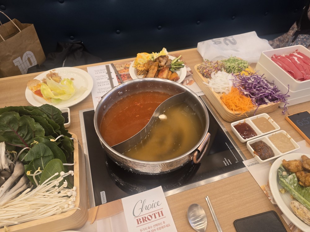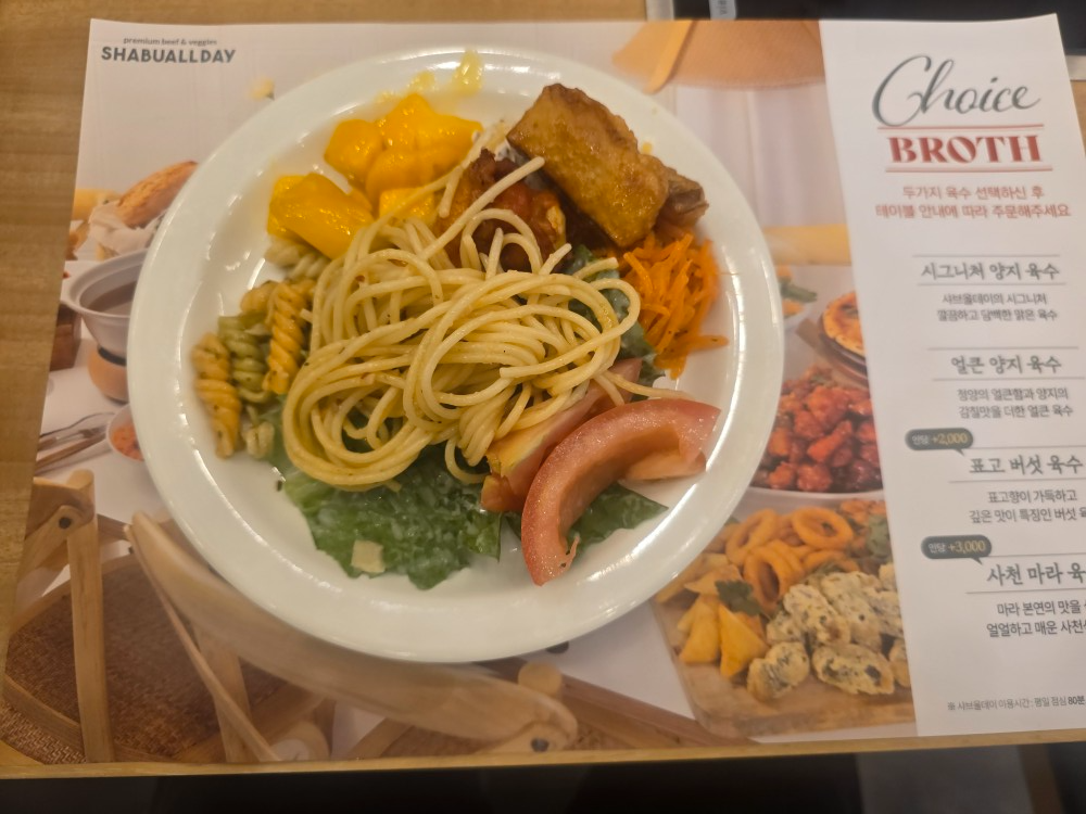 매장 외관은 간결하면서도 단정했고, 내부로 들어섰을 때 가장 먼저 눈에 들어온 건 셀프바의 구성. 다양한 채소류, 버섯, 고명들이 깔끔하게 정리되어 있었고, 전체적으로 위생 상태도 좋았다. 보기만 해도 안심이 되는 구성이라는 느낌이었다. 샤브올데이라는 이름이 낯설지 않게 다가온 첫 순간이었다.