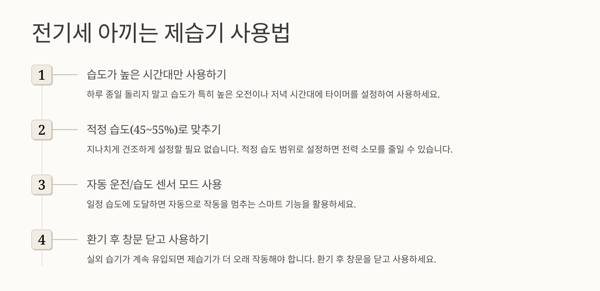 → 하루 종일 돌리지 말고 오전/저녁으로 시간 설정 - 적정 습도(45~55%)로 맞추기