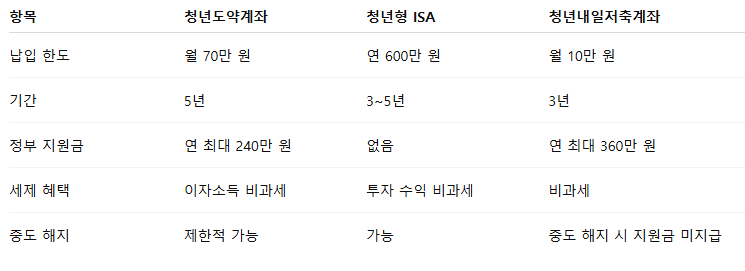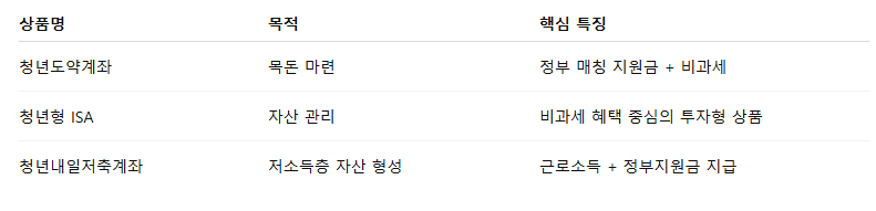 이 세 계좌는 모두 청년층을 위한 제도지만, 대상 조건과 혜택 구조가 매우 다릅니다.