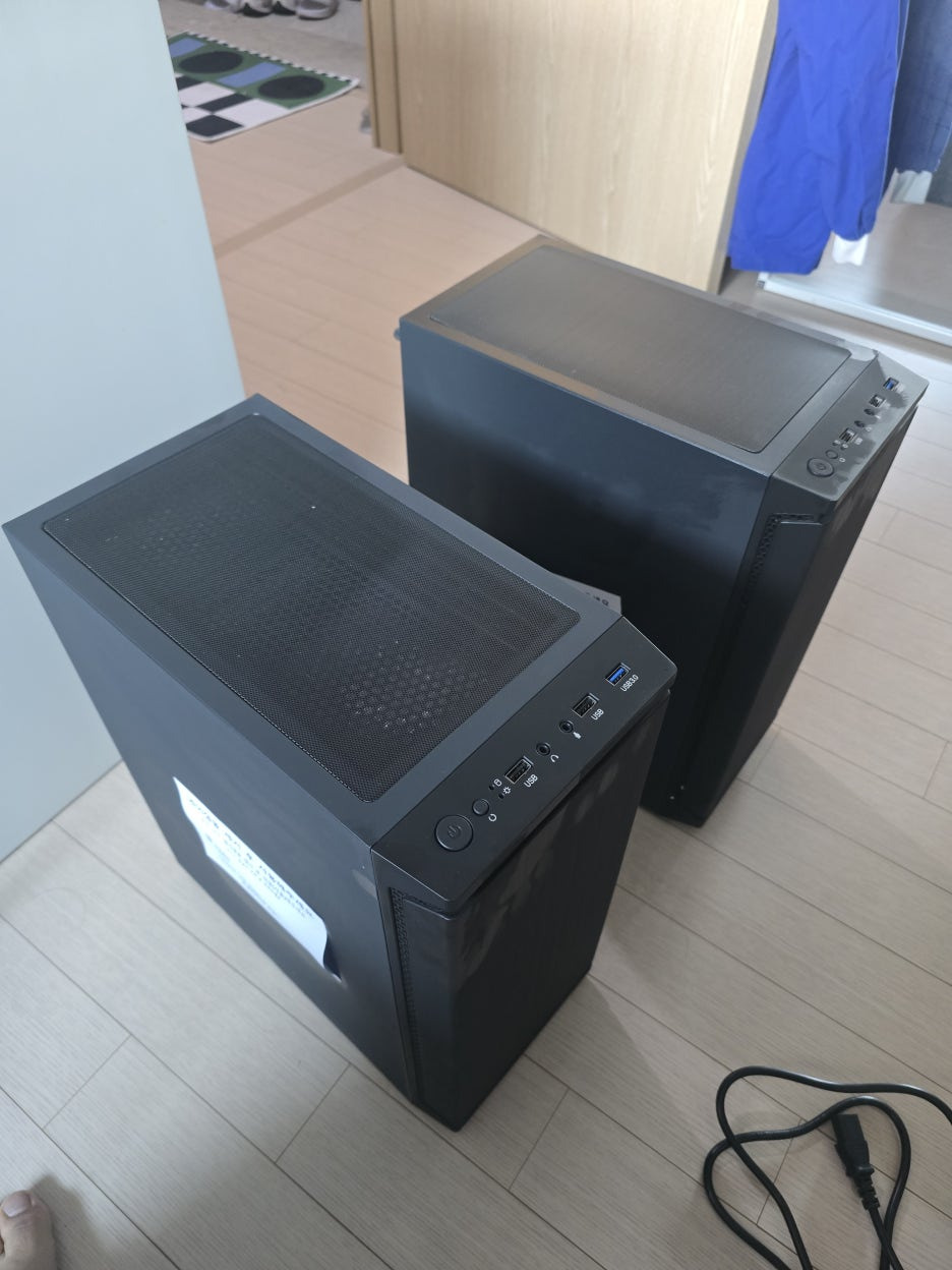 💸 금액대는 약 90만원대로 구성되었습니다. 가성비를 고려하면 매우 만족스러운 조합입니다! 두 대의 PC 모두 동일한 사양으로 구성되었습니다. 케이스도 동일한 모델로, 깔끔한 디자인과 전면 포트 구성으로 편리함을 제공합니다. 사진에서도 보이듯이 상단 메쉬 디자인이 특징입니다.