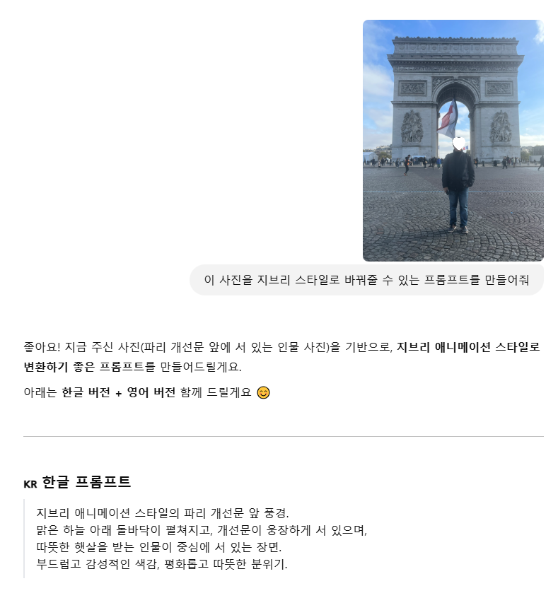 - 💬 “이 사진을 지브리 스타일로 바꿔줄 수 있는 프롬프트를 만들어줘” 라고 ChatGPT에게 요청