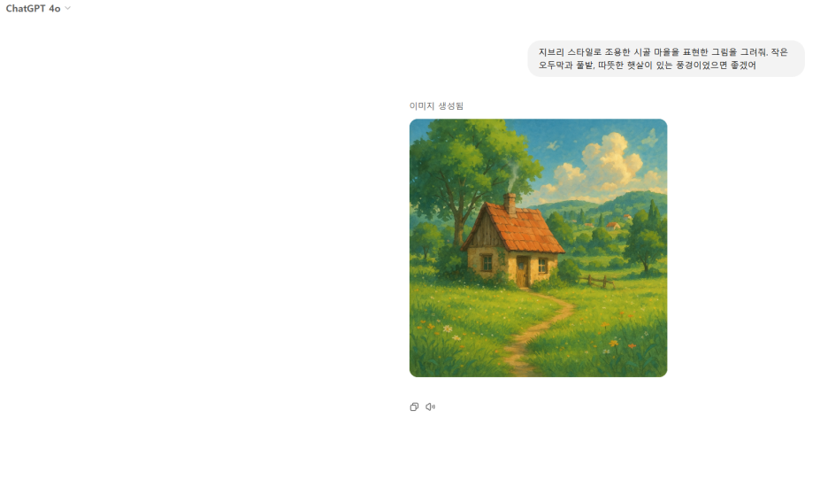 "지브리 스타일로 조용한 시골 마을을 표현한 그림을 그려줘. 작은 오두막과 풀밭, 따뜻한 햇살이 있는 풍경이었으면 좋겠어".